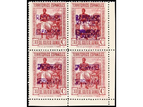 * COLONIAS ESPAÑOLAS: GUINEA. Ed. 223Bhi, 223Bhh. 30 cts. carmín. Bloque de cuatro, dos sellos HABILITACIÓN INVERTIDA y un sello DOBLE. RARO.
