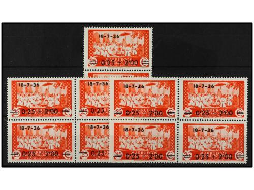 ** COLONIAS ESPAÑOLAS: TANGER. Ed. 161 (10). 0,25+2,00 pts. sobre 25 cts. rojo. 10 sellos en pareja y bloques. LUJO. Cat. 1.000€.