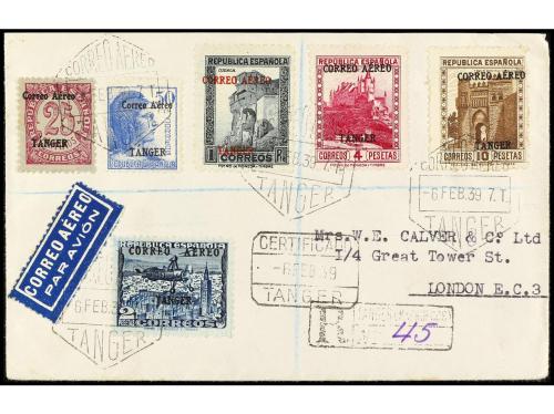 ✉ COLONIAS ESPAÑOLAS: TANGER. Ed. 108/13. 1939. SOBRE CERTIFICADO, mat. fechador TANGER, dirigido a LONDON. Sobre filatélico sin llegada. Se adjunta sobre a Francia con sellos Ed. 128/32, 4 de cada, con llegada.
