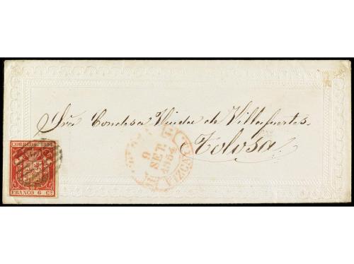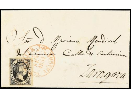 ESPAÑA. Ed. 6. 1851. ENVUELTA circulada a ZARAGOZA. 6 cuartos negro. Mat. fechador GALLUR / ARAGON en rojo. Parte del margen izquierdo del sello añadido para embellecer la pieza. Preciosa y RARA. Cert. COMEX.