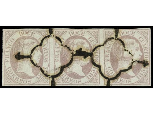 ° ESPAÑA. Ed. 7(3). 12 cuartos lila. Tira de tres. Muy bonita. Cert. COMEX.