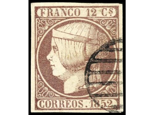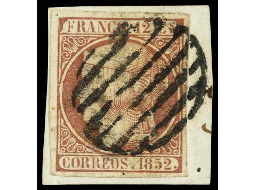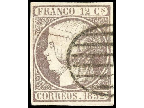 ESPAÑA. Ed. 13. 1852. IGUALADA a HUESCA. 12 cuartos lila. Mat. PARRILLA. MAGNÍFICA. Cert. CEM.