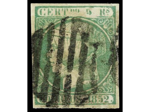 ° ESPAÑA. Ed. 5. 10 reales verde, grandes márgenes, mat. dejando la carta de la Reina despejada. PIEZA DE LUJO. Cert. COMEX y PF. Cat. 3.100€.