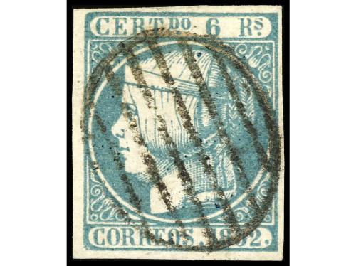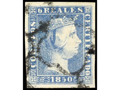 º ESPAÑA. Ed. 16. 6 reales azul Mat. Parrilla. Muy buen ejemplar. Cert. COMEX y FERCHENBAUER. Cat. 700€.