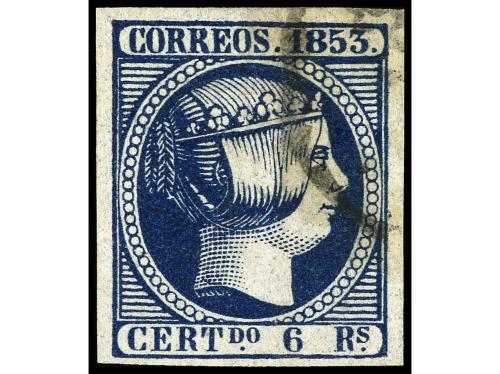 (*) ESPAÑA. Ed. 21it. 6 reales azul SIN PUNTO debajo de la "S" de "Rs" y además "R" de "Rs" con el pie derecho alargado. No reseñado y único ejemplar conocido. Cert. GRAUS.