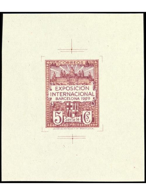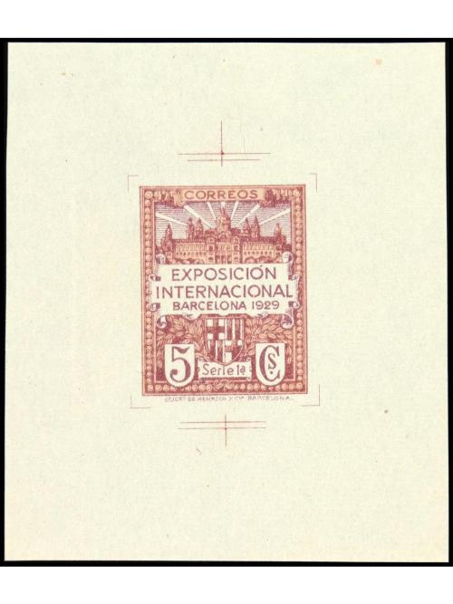 ESPAÑA: AYUNTAMIENTO DE BARCELONA. PRUEBA DEL REPORTE ORIGINAL. 5 cts. violeta oscuro y rosa. RARA. (Gálvez B9).
