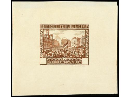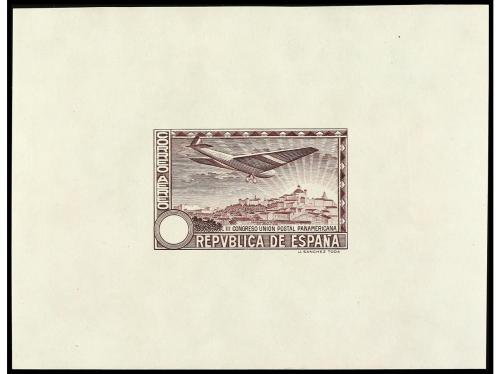 ESPAÑA. UNIÓN POSTAL PANAMERICANA. CORREO AÉREO. PRUEBA DE PUNZÓN grabado sin terminar en color castaño violeta sobre papel ordinario. RARA. (Gálvez CA 424).
