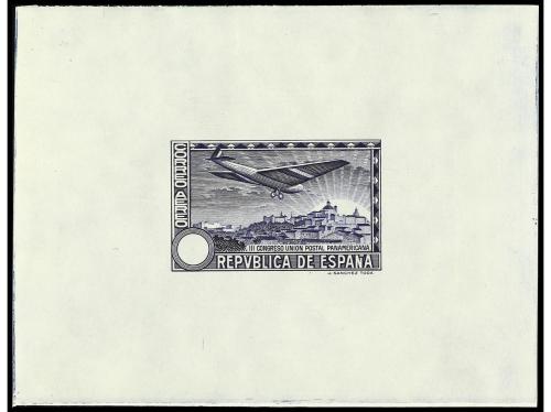 ESPAÑA. UNIÓN POSTAL PANAMERICANA. CORREO AÉREO. PRUEBA DE PUNZÓN grabado sin terminar en color azul ultramar sobre papel estucado. No reseñada. RARA.