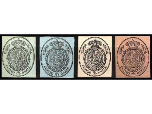 * ESPAÑA. Ed. 37. 4 onzas CAMBIOS DE COLOR DEL PAPEL. Cuatro sellos, verde amarillo, azul, rosa y rosa salmón. RARO CONJUNTO.