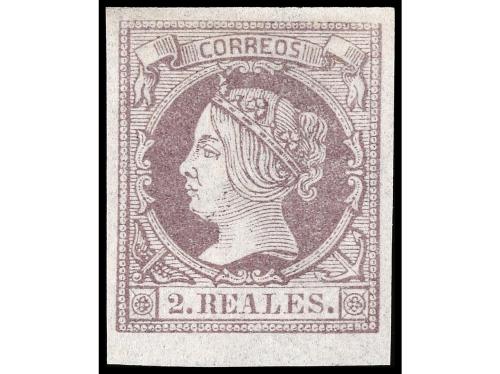 (*) ESPAÑA. Ed. 56. 2 reales lila, borde inferior de hoja, PIEZA DE LUJO, Cert. COMEX. Cat. 480€.