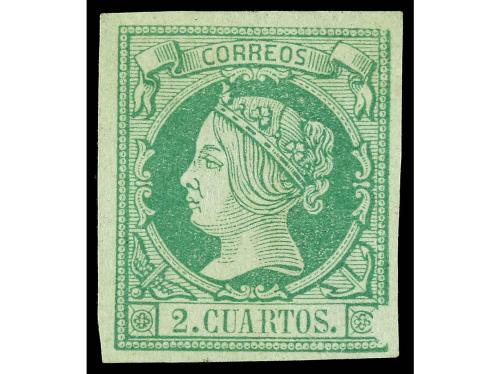 * ESPAÑA. Ed. 43. 2 cuartos verde. Tres amplios márgenes. Muy buen ejemplar. RARO. Cert. GRAUS.