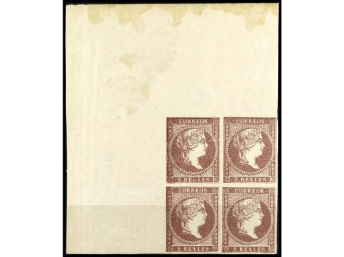 ** ESPAÑA. Ed. 49/50 (4). 1 real azul y 2 reales violeta. Bloques de cuatro esquina de pliego. Espectacular calidad.