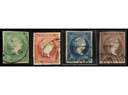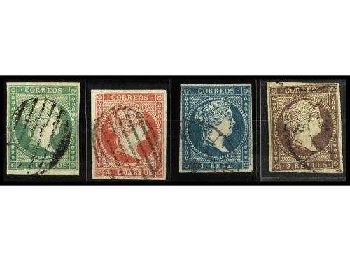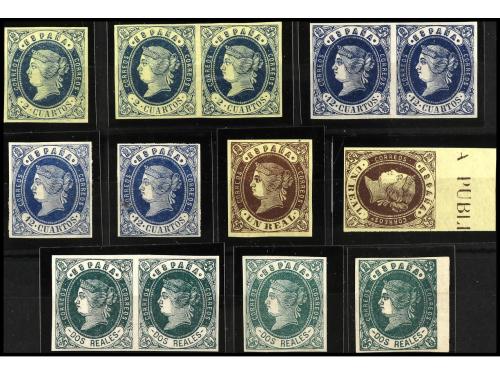 ° ESPAÑA. Ed. 51, 53, 55, 56. 2 cuartos bloque de seis (RARO) y 12 cuartos bloque de cuatro, 1 real dos bloques de cuatro, 2 reales tres bloques de cuatro. El 2 cuartos cert. GRAUS.