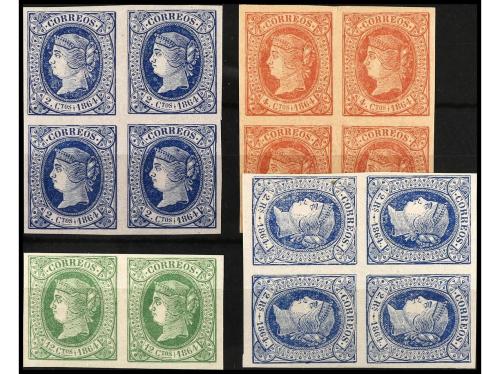° ESPAÑA. Ed. 75, 76, 79. 4 cuart. 3 bloques de cuatro, 12 cuartos bloque de cuatro y 2 reales bloque de cuatro.