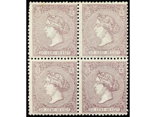 ** ESPAÑA. Ed. 85 (4). 20 cts. violeta. Bloque de cuatro, tres sellos goma tonalizada. Cat. 1.050€.