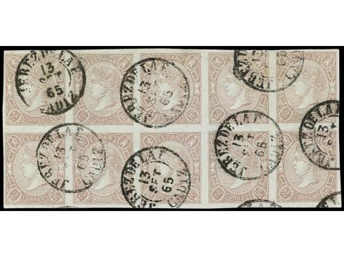 ° ESPAÑA. Ed. 73 (10). 2 reales lila. Bloque de diez. mat. fechador. JEREZ DE LA F./CADIZ. PRECIOSO. Cert. COMEX.