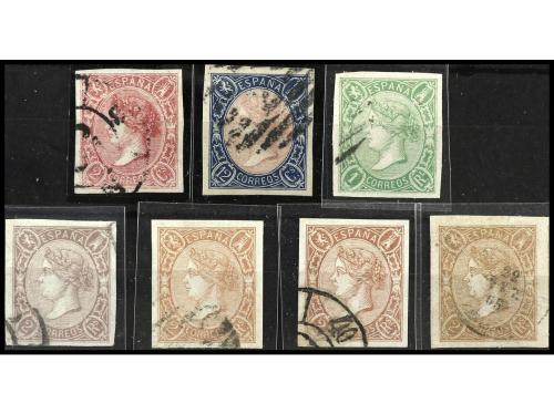 ° ESPAÑA. Ed. 69, 70, 72, 73, 73A. Conjunto de sellos en usado con cinco tonalidades de color distintas del 2 reales. Precioso conjunto.