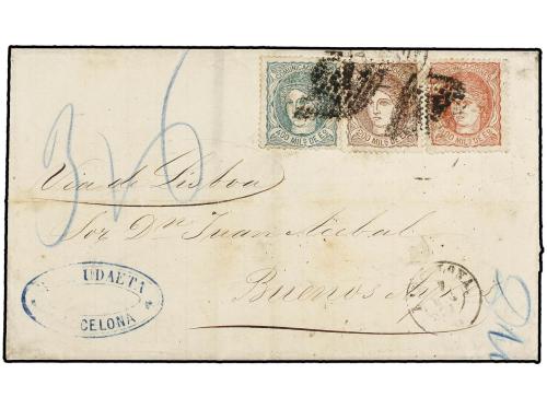 ESPAÑA. Ed. 108, 109, 110. 1871. BARCELONA a BUENOS AIRES. 100 mils. castaño rojo, 200 mils. castaño y 400 mils. verde, mat. PARRILLA DE PUNTOS, circulada vía Lisboa. Muy raro franqueo tricolor correspondiente a un doble porte.