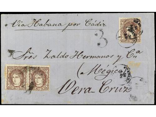 ESPAÑA. Ed. 109 (3). 1871. GRANADA a VERACRUZ (México). 200 mils. castaño (3). Porte simple por la vía Española. RARA.