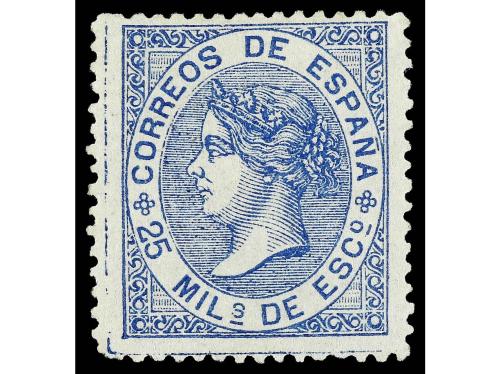 (*) ESPAÑA. Ed. 97. 25 mils. azul. Ejemplar con salto de peine y con una interesante variedad de una doble impresión de la línea del marco a la izquierda y abajo.