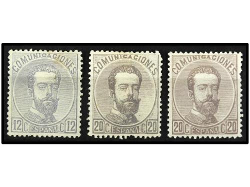 (*) ESPAÑA. Ed. 122, *123, *123a. 12 c. gris sin goma, 20 c. gris dentado, retocado y 20 c. lila un diente corto. Centrados. Cat. 290€.
