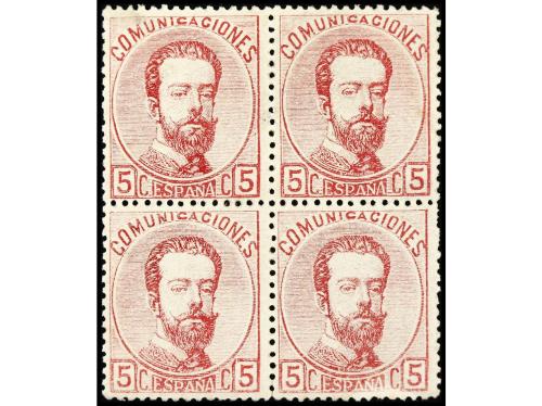 **/* ESPAÑA. Ed. 118. 5 cts. rosa. Bloque de cuatro. Sellos inferiores sin fijasellos. Cat. 169€.