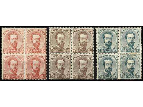 * ESPAÑA. Ed. 118 (4), 124 (4), 126 (4). 5 cts. rosa, 25 cts. castaño y 50 cts. verde. Bloques de cuatro. Colores muy frescos, sello de 50 cts. leve pliegue en los sellos de la derecha. Cat. 994€.