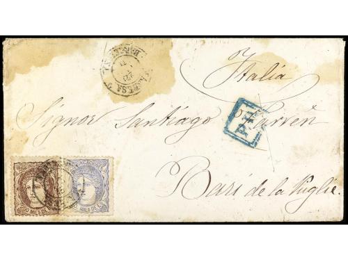 ESPAÑA. Ed. 107, 109. 1871. MANRESA a BARI (Italia). 50 mils. azul y 200 mils. castaño. Carta DESINFECTADA (corte de desinfección y manchas de vinagre). RARO franqueo en exceso de 50 mils. MUY RARA. Cert. Graus, E. Domenech.