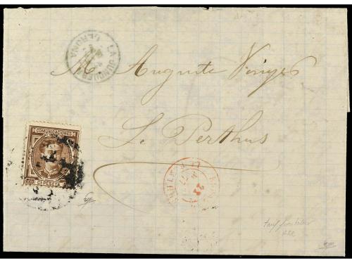 ESPAÑA. Ed. 177. 1877. AGULLANA a LE PERTHUS. 25 cts. castaño. TARIFA FRONTERIZA de doble porte.