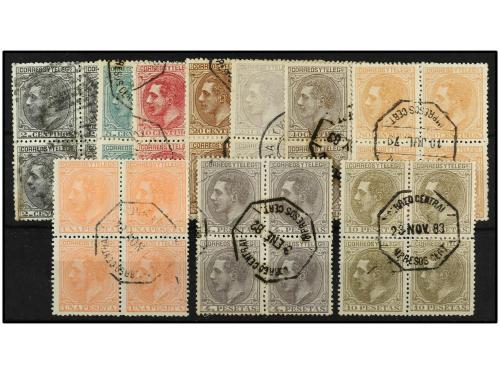 º ESPAÑA. Ed. 198. 4 pts. violeta. Bloque de cuatro, mat. octogonal IMPRESOS MADRID en azul. Magnífico y muy raro. Cat. 825€.