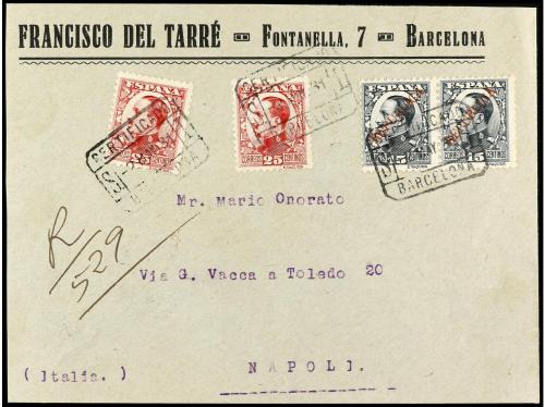 ESPAÑA E. LOCALES PATRIOTICAS: BARCELONA. Ed. 23 (2). 1931 (2 mayo). BARCELONA a ITALIA. 25 cts. carmín (2) y dos sellos de 15 cts. verde habilitados REPUBLICA. RAROS verdaderamente circulados y más a extranjero, al dorso llegada.