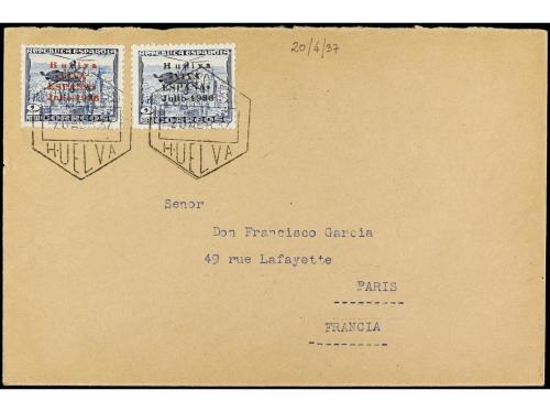 ESPAÑA E. LOCALES PATRIOTICAS: HUELVA. Ed. 14 y 14hcc. 1937. HUELVA a FRANCIA. 2 pts. azul habilitaciones en negro y rojo. Raros en carta, al dorso llegada.