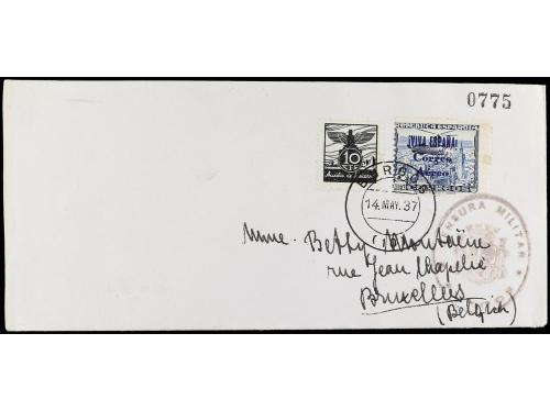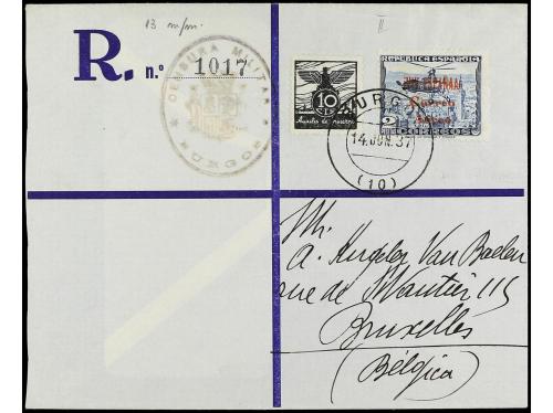 ESPAÑA E. LOCALES PATRIOTICAS: BURGOS. Ed. 72heb. 1937. BURGOS a BÉLGICA. 2 pts. azul habilitación en rojo tipo I. Variedad "VIV ESPAÑAA". Raro en carta. Al dorso llegada.