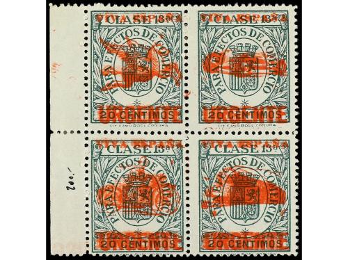 * ESPAÑA E. LOCALES PATRIOTICAS: BURGOS. Ed. 72 + 72hec. 2 pts. azul. Bloque de cuatro habilitación en rojo tipo II. Sellos inferiores variedad "VIV ESPAÑAA". MUY BONITO.