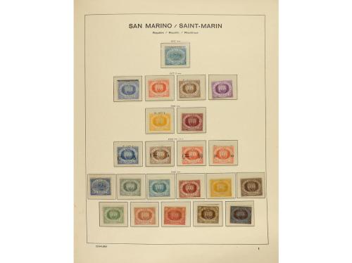 LOTES y COLECCIONES. SAN MARINO. Colección en álbum Shaubeck de 1877 a 1988 muy completa (faltan muy pocos ejemplares). Todos los sellos nuevos en general de buena calidad, aunque hay alguno con sombras del tiempo. Incluye la mayoría de ejemplares de valor. Hay correo, aéreos, hojitas, tasas, etc. Cat. Yvert. + 16.000Ђ. Foto en web (ex-12).