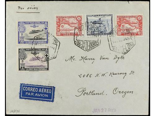ESPAÑA. Ed. 689, 694 (2), 339/40. 1936. BARCELONA a U.S.A. Precioso franqueo.