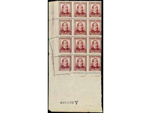 ** ESPAÑA. Ed. 685. 25 cts. carmín lila. Bloque de nueve. Tira vertical SIN DENTAR EL MARGEN IZQUIERDO. Variedad producida por un desplazamiento del dentado por pliegue del papel. MUY RARA.