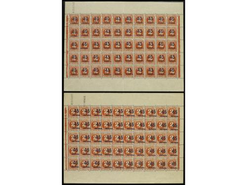 ** ESPAÑA. Ed. 744+744VAR (50). 45 cts. sobre 2 cts. castaño. 2 hojas de 50 ejemplares, una con sello tipo y otra con HABILITACIÓN DESPLAZADA A LA DERECHA.