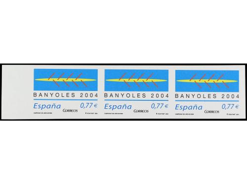 ** ESPAÑA. Ed. 4064s (3). BANYOLES 2004. 0,77Ђ azul, amarillo y rojo. Tira de tres SIN DENTAR. RARÍSIMO. Cert. COMEX.