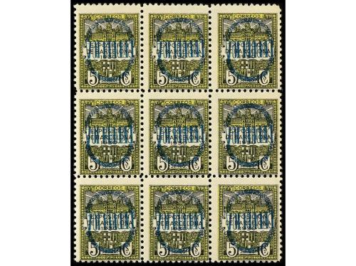 ** ESPAÑA: AYUNTAMIENTO DE BARCELONA. Ed. NE 6. NO EXPENDIDO. 5 cts. verde y negro HABILITACIÓN INVERTIDA. Bloque de nueve. RARO. Cat. 1.278€.