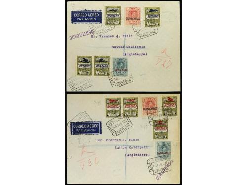ESPAÑA: AYUNTAMIENTO DE BARCELONA. Ed. NE 13/16. 1932. BARCELONA a INGLATERRA. Dos cartas circuladas con sellos de 5 cts. y 1 pta. más la serie completa NO EXPENDIDA. Al dorso llegada. Muy rara circulada al extranjero.