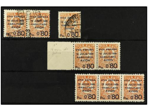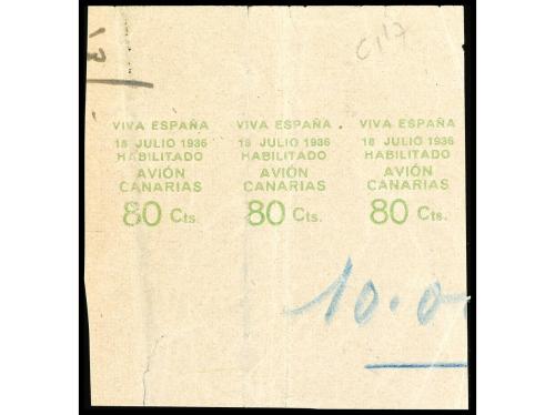 **/* ESPAÑA: CANARIAS. Ed. 2ha, 2hab, 2 hac. 80 c. s. 2 c. Tira de 3 con "3 GRANDE" y "6 GRANDE", pareja con "18" próximo a "Julio" y otros sellos en usado y variedades menores.