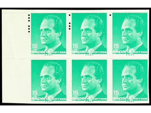 ** ESPAÑA. Ed. 3004. 15 p. verde. Bloque de 6. Parte superior dentado parcial. Los 3 sellos inferiores, marcas de perforación apenas visibles, quedando sin dentar.