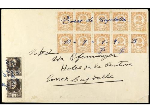 ESPAÑA. Ed. 663 (2), 678 (10). 1933. Sobre con franqueo de 2 cts. castaño rojo (10) y 5 cts. castaño negro (2) mat. manuscrito "Torre de Capdella, 10-9-1933". RARO.