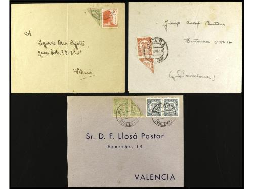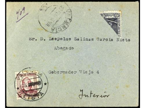 ESPAÑA. Ed. 685, 738. 1938. VALENCIA correo interior. Sobre circulado inicialmente con sello bisectado de 50 cts. este sello no se aceptó (existía una ordenanza prohibiendo la circulación de sellos bisectados pero ante la falta de sellos durante la Guerra se le hizo muy poco caso, pero no esta ocasión) y se reclamó el franqueo añadiéndole un sello de 25 cts. que cubría el franqueo. MUY INTERESANTE.