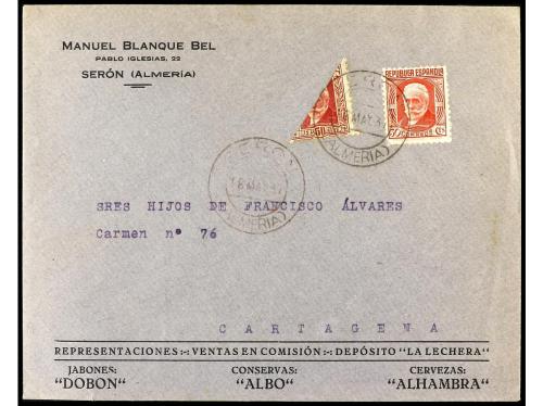 ESPAÑA. Ed. 669, 734. 1937. SERÓN a CARTAGENA. 30 cts. carmín dos, uno de ellos bisectado para completar la tarifa de 45 cts. Muy curiosa combinación de franqueo con dos sellos de 30 cts. de Pablo Iglesias distintos.