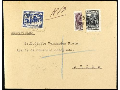 ESPAÑA. Ed. 693, 666. 1937. BARCELONA a ÁVILA. 20 cts. violeta bisectado y 1 pta. negro bisectado para completar la tarifa de certificados de 60 cts. Rarísima combinación de franqueo, al dorso llegada.