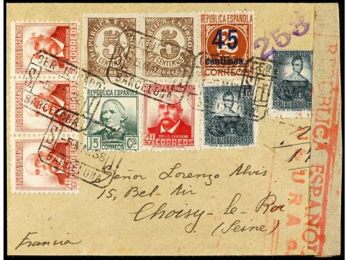 ESPAÑA. Ed. 736 (4), 732 (2), 733, 744, 745 (2). 1938. BARCELONA a FRANCIA. Carta certificada, espectacular franqueo con el raro 40 cts. rosa, al dorso llegada.