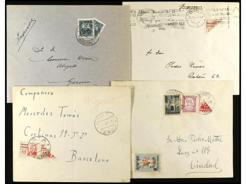 ESPAÑA. 1938-39. CIFRAS. Conjunto de 5 cartas, cuatro de ellas con distintas combinaciones con sellos BISECTADOS para hacer la tarifa de 45 cts. y una para la tarifa interior de 25 cts. Muy interesante y difícil de reunir.