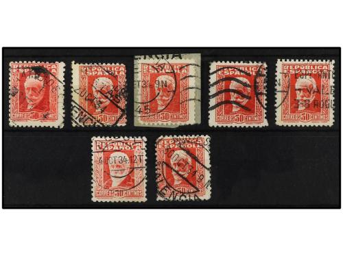 ° ESPAÑA. Ed. 669F (7). 30 cts. rojo FALSO POSTAL, tipo II. Conjunto de 7 sellos en usado con diferentes matasellos. INTERESANTE CONJUNTO.
